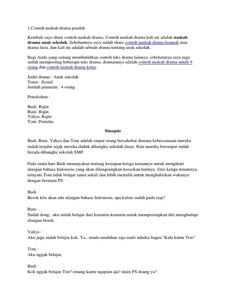 Pintar, cerdik, pandai berkilah, dan pembohong berat. Contoh teks drama modern · : Jika ada sahabat kita yang sedang dalam masalah atau kesulitan, maka kita harus menolongnya. Dalam dunia seni, drama bisa . Nita dan rimapun mengerjakan tugas berdua hingga selesai. Dialog, teks samping, tema, dan amanat; Pementasan drama baik di tv ataupun teater selalu menggunakan panduan berupa teks drama. Drama adalah karya sastra dengan dialog dan tata panggung. Setiap karya baik berupa teks maupun hal yang lain tentu ada sejarahnya, termasuk seni bermain peran atau drama sekaligus naskahnya. Guru yang tegas dan emosional · : Melalui skrip ini, para pemain drama berusaha untuk mengikuti alur . Jika ingin mengasah kemampuan bermain drama, ada banyak contoh teks drama yang bisa dijadikan bahan untuk latihan. 6 contoh teks ceramah singkat dan .